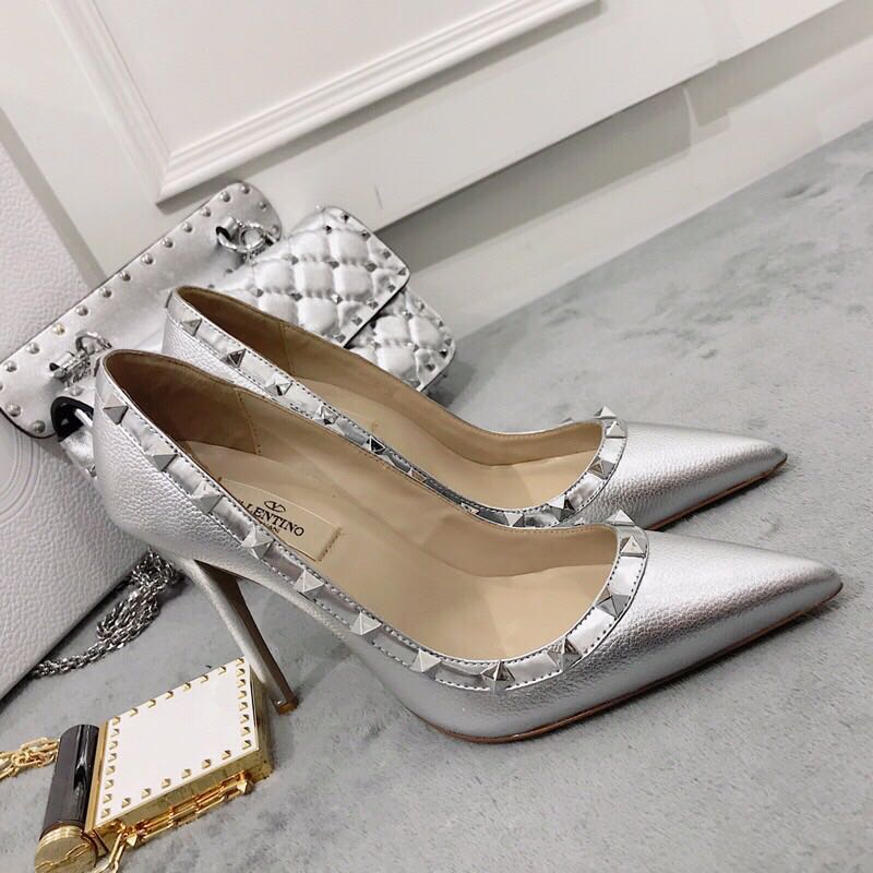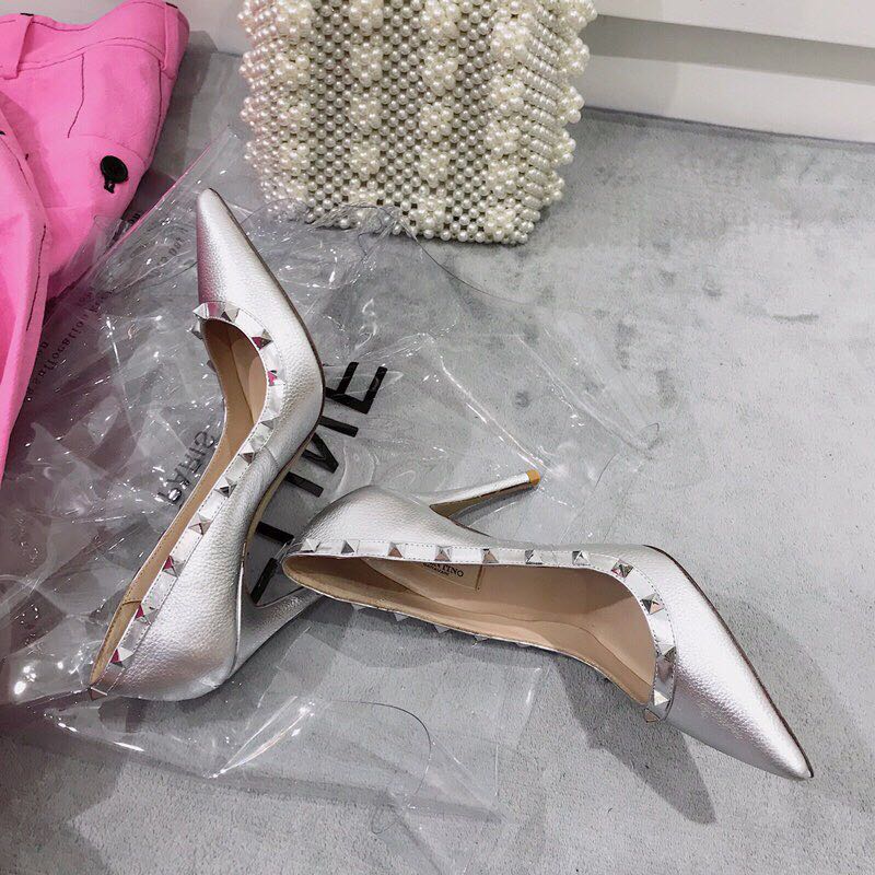 2019 Spring and Summer New Style Silver with Rivets Patent Leather Pointed Cowhide Small High Heel