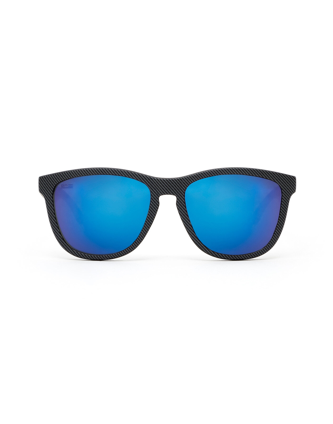 Black frame with carbon fibre print combined with blue mirror lenses.