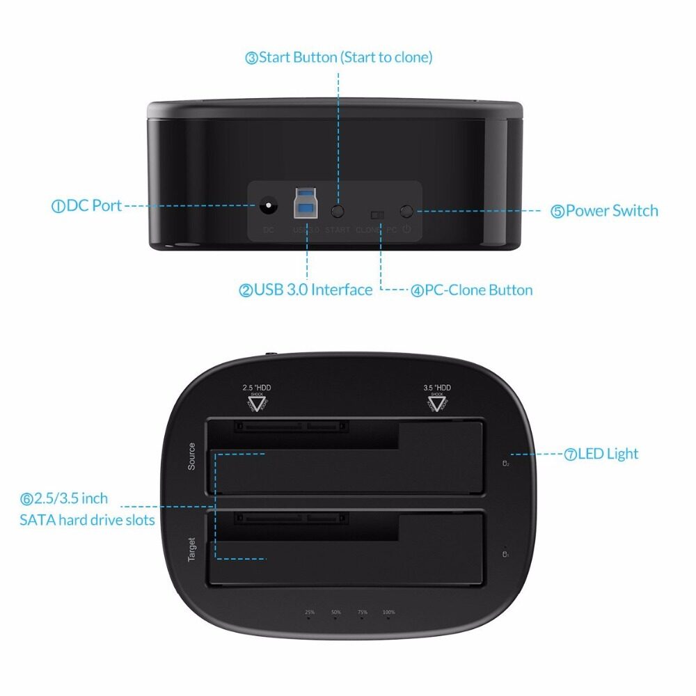 ORICO Hard Drive Docking Station with Offline Clone SATA to USB3.0 Dual-bay 2.5/3.5 Hard Disk Drive Docking Station 1 to 1 Clone(6228US3-C)