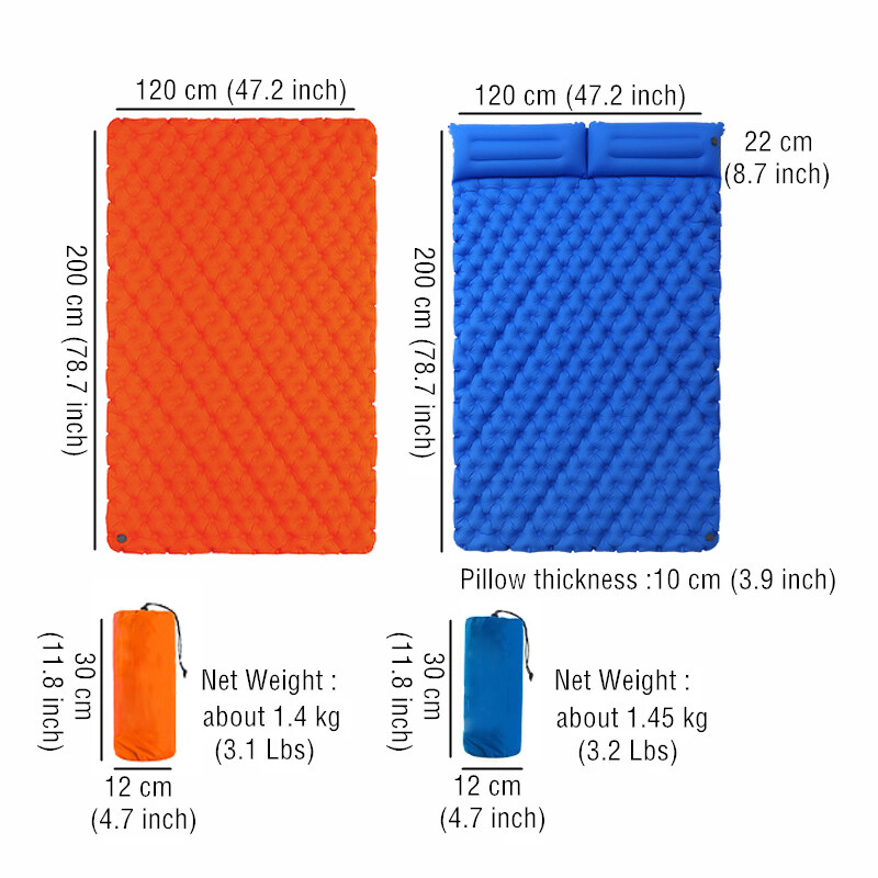 Premium ultralight Rip stop 20D Nylon fabric and extruded TPU Lamination,no any chemical smell.It gives you a durable sleeping pad,no worry about sharp stone or branch. Weigh only 1100gabout, Camping Pad is easy to carry and perfect for your tent and camping.