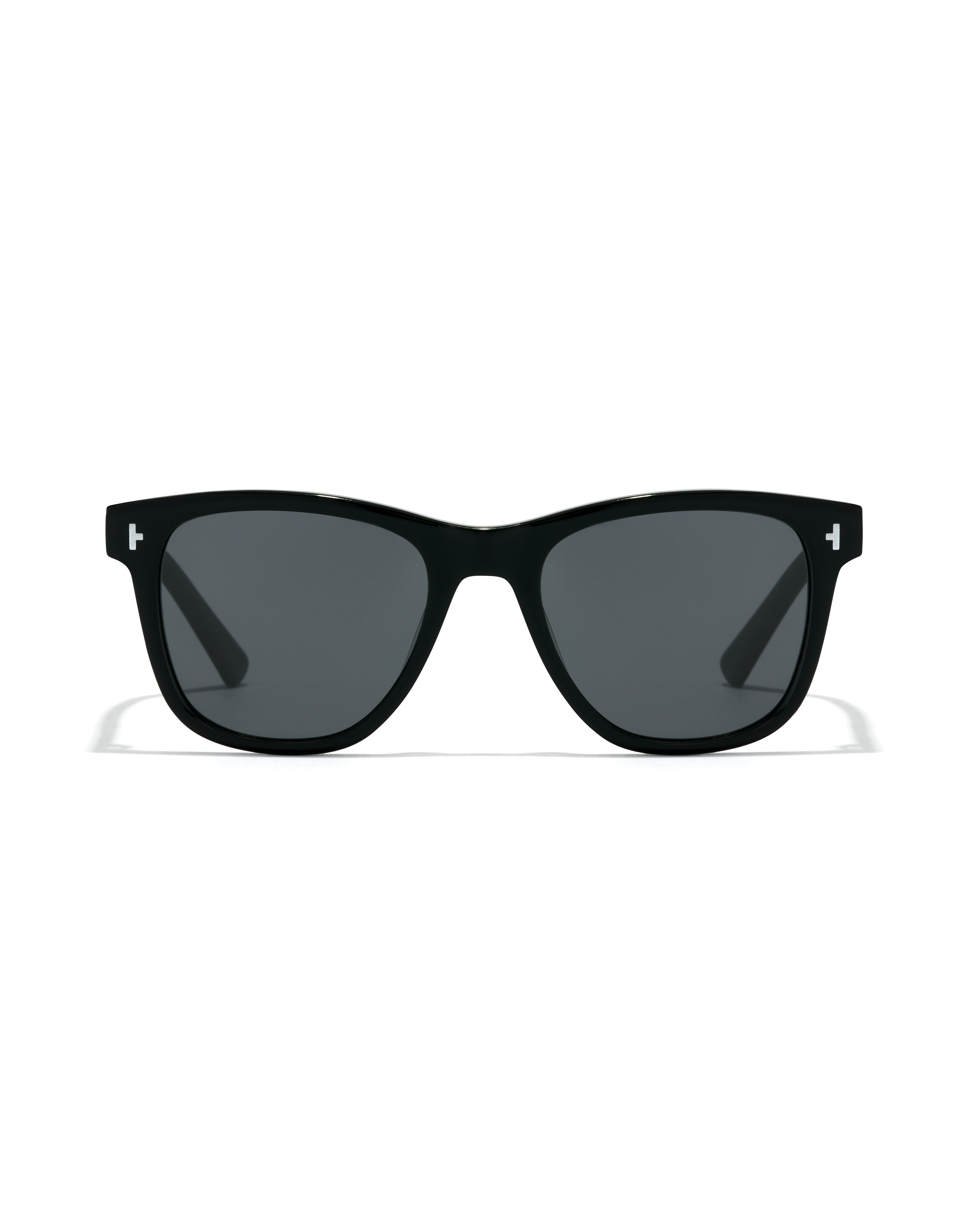 Acetate design with glossy finish and polarized lenses. The black color permeates the entire frame except for the metallic pins on the front. The temples form a sharp curve, adding dynamic to this premium version of the classic One.