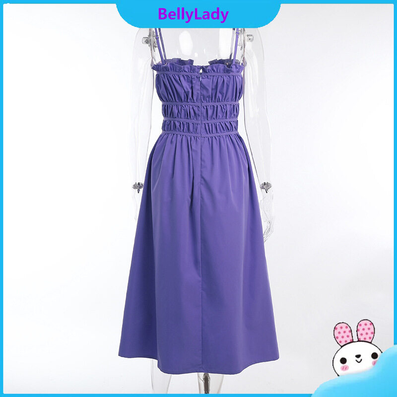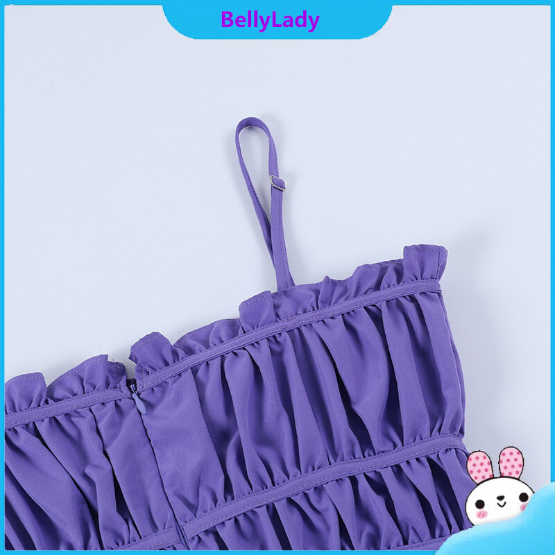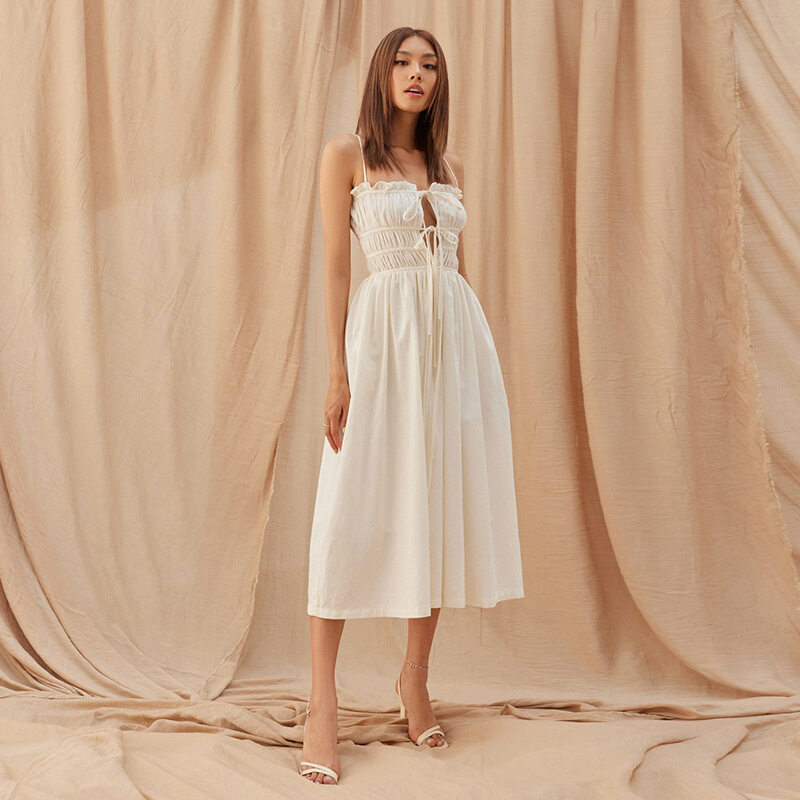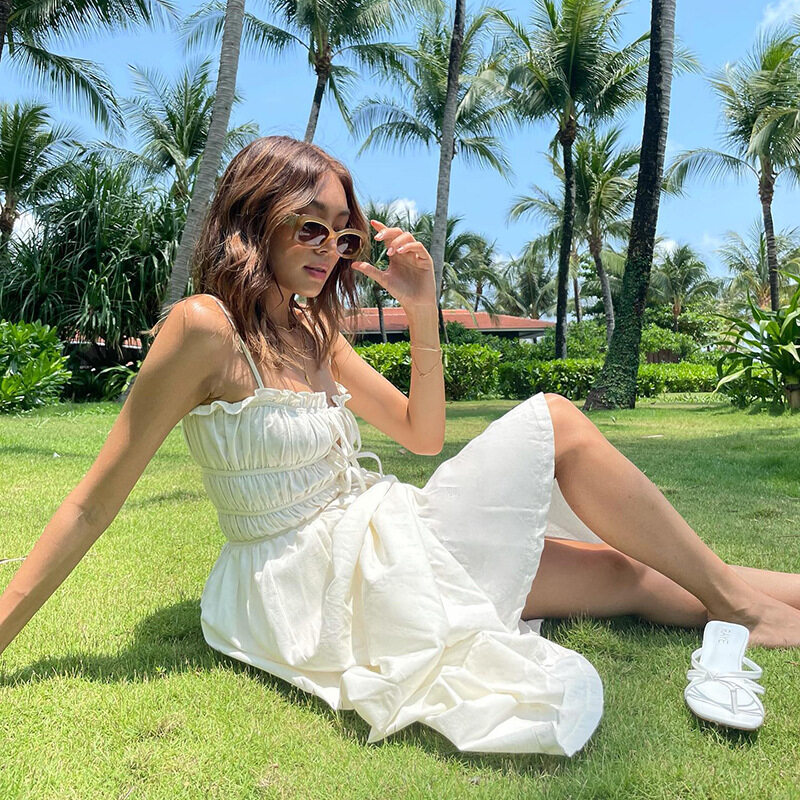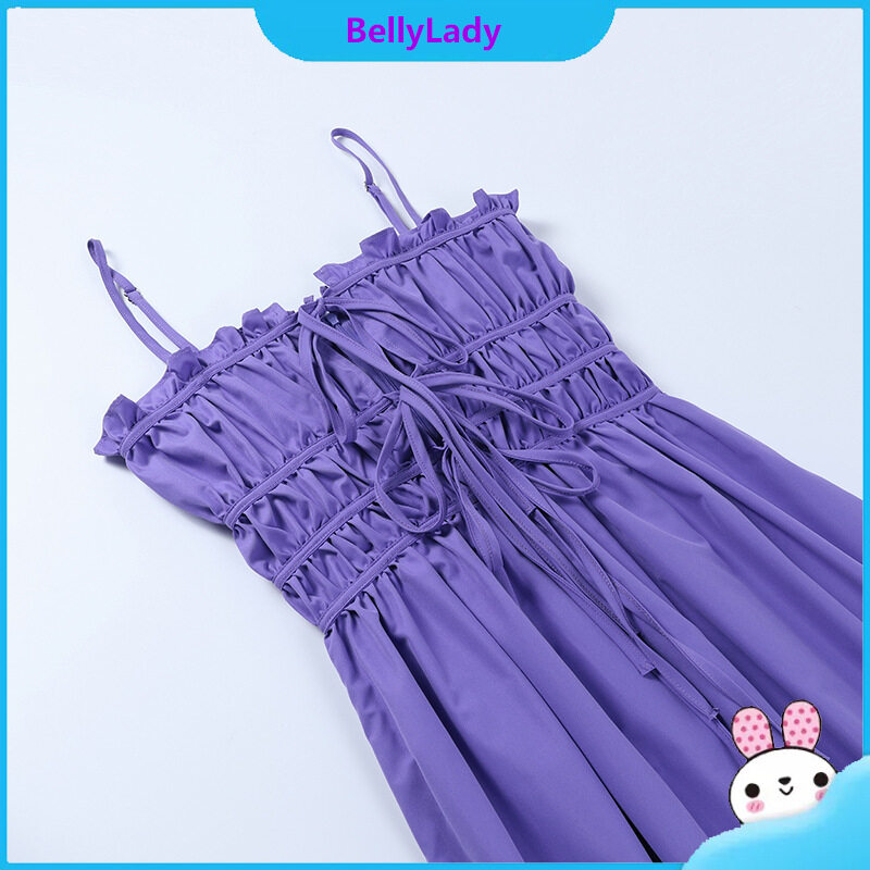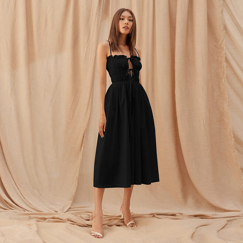 Women Suspender Dress Sexy Lace-up Hollowed-out Midi Skirt Fashion Solid Color High Waist Ruffled Dress