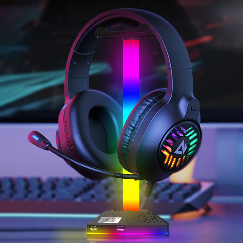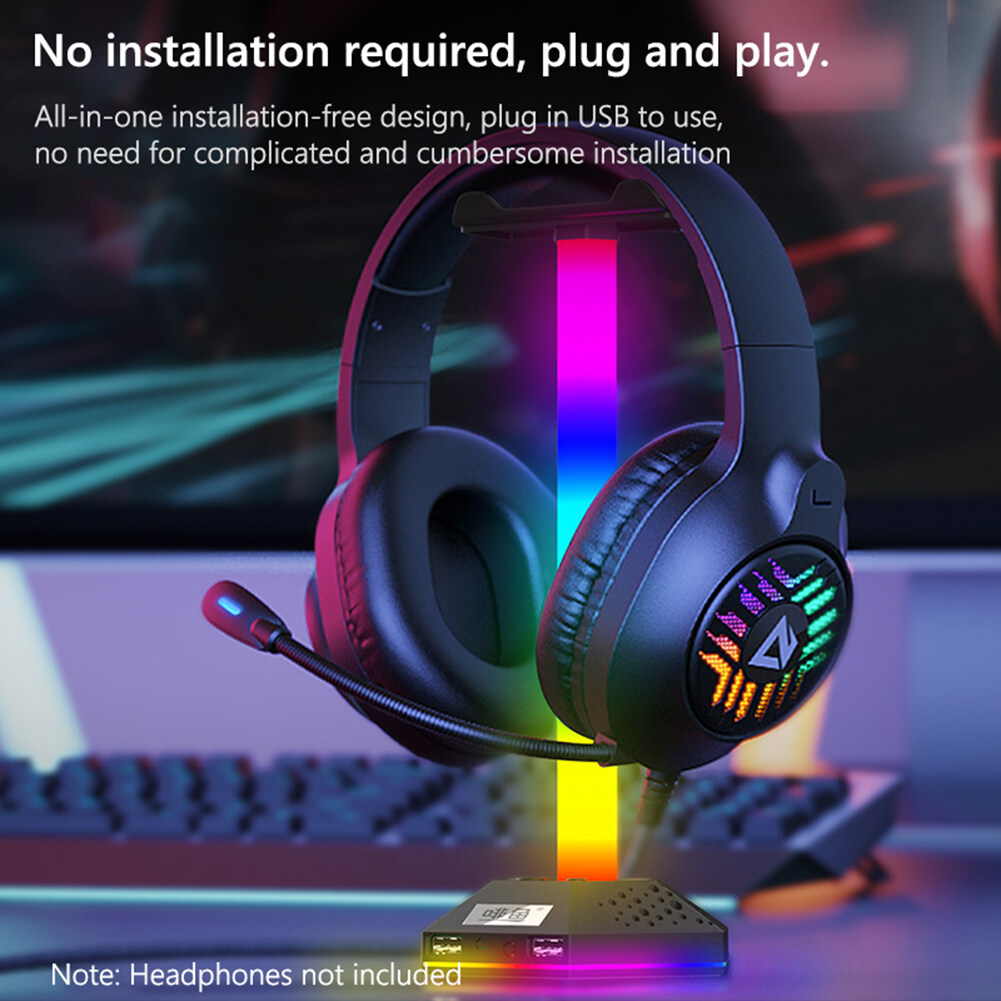 RGB Gaming Headphone Stand 12 Light Modes Headset Holder Bracket Universal Headphones Hanger Hollow Translucent Base Dual USB2.0 Expansion Interface 3.5mm Audio