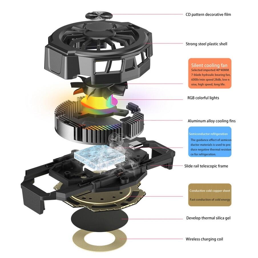 Mobile phone cooler with cool RGB fan to play all kinds of games without worrying about fever, it's cool.