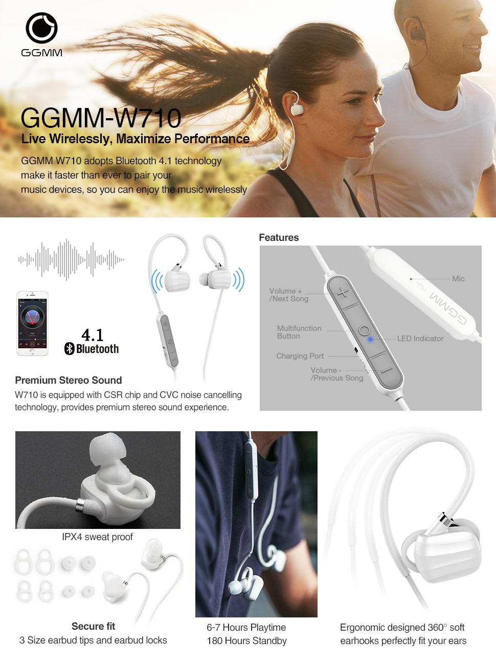 GGMM W710 Wireless Bluetooth Sport Earphone With Remote Control Microphone Black White Noise Reduction In Ear Hook Noise Cancelling Comfortable 7Hrs Waterproof High Quality Sound Earbud Hook HD Clarit
